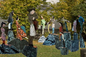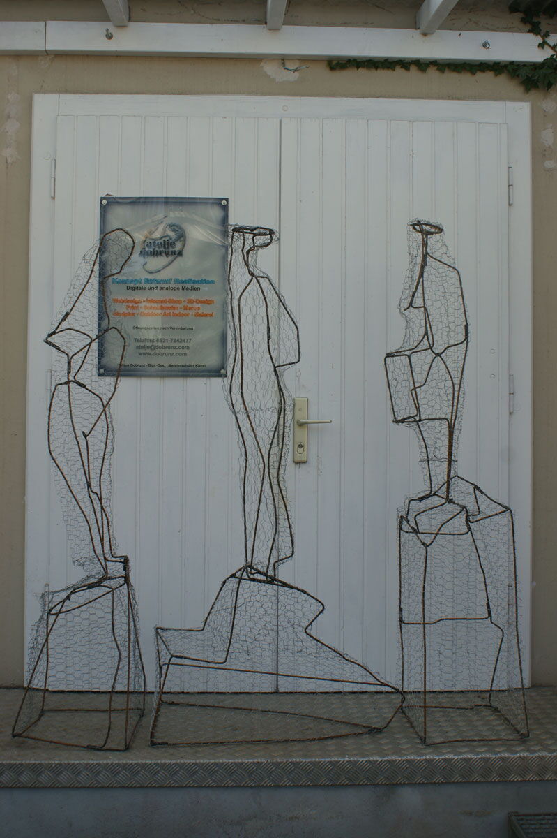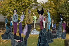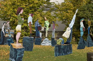 Vier Foto-Montagen: In der Mitte ist jeweils die Skulptur "Papoly 0883" zu sehen, umgeben von Skulpturen aus der Serie "Passanten".