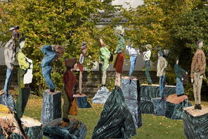 Vier Foto-Montagen: In der Mitte ist jeweils die Skulptur "Papoly 0883" zu sehen, umgeben von Skulpturen aus der Serie "Passanten".
